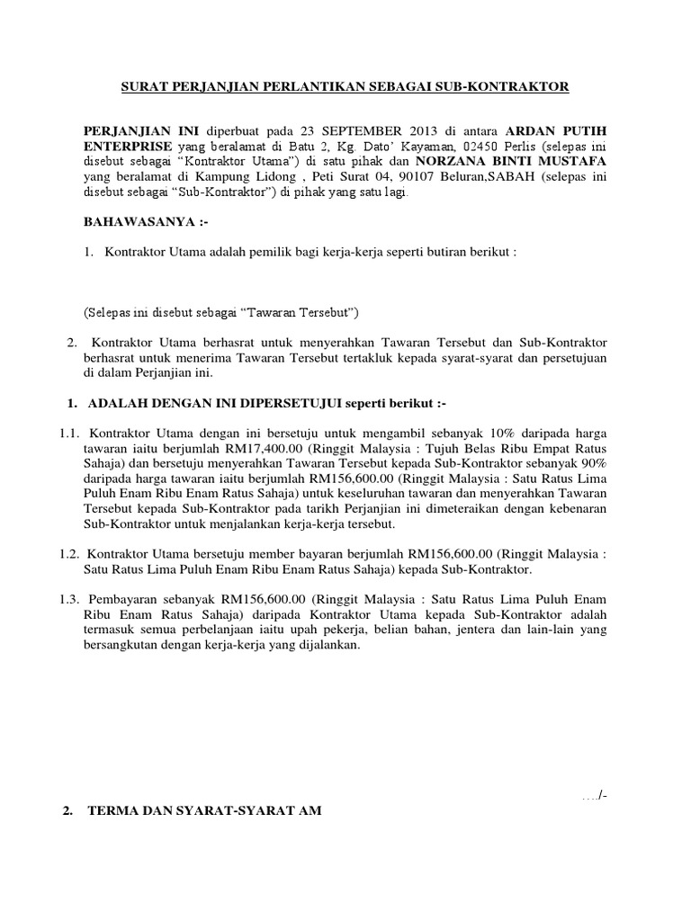 Surat Perjanjian Perlantikan Sebagai Sub Kontraktor Pdf